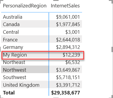 PersonalizedRegion = if (USERPRINCIPALNAME() = "<my email>" && SalesTerritory[SalesTerritoryRegion] = "Southeast", "My Region", SalesTerritory[SalesTerritoryRegion])